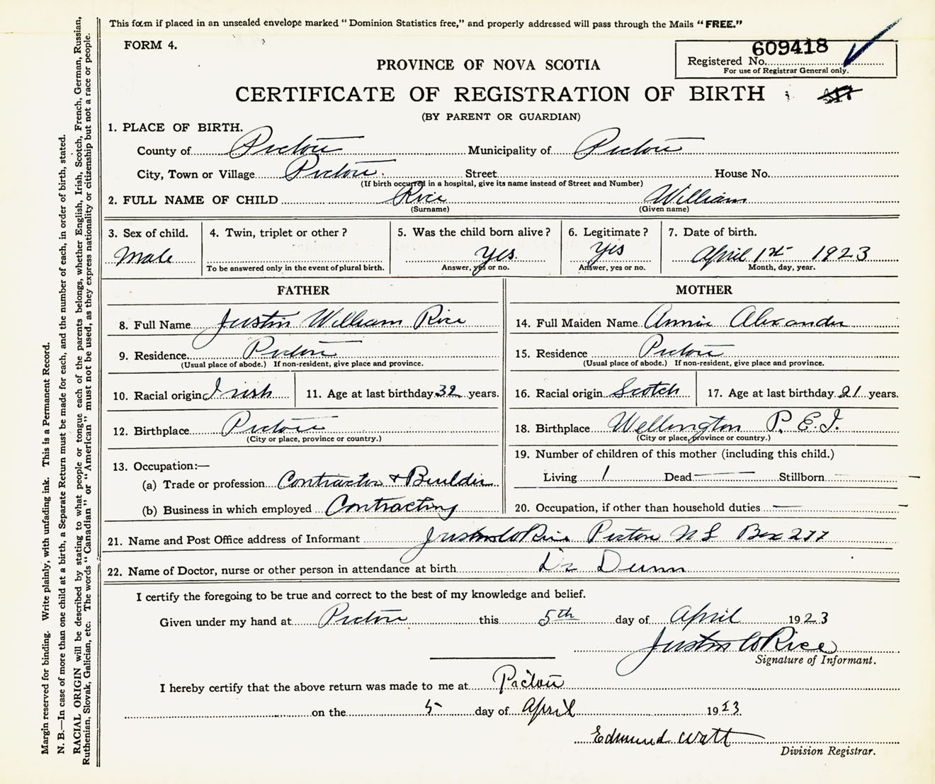 Male Birth Registration: Year: 1923 number: 60900418