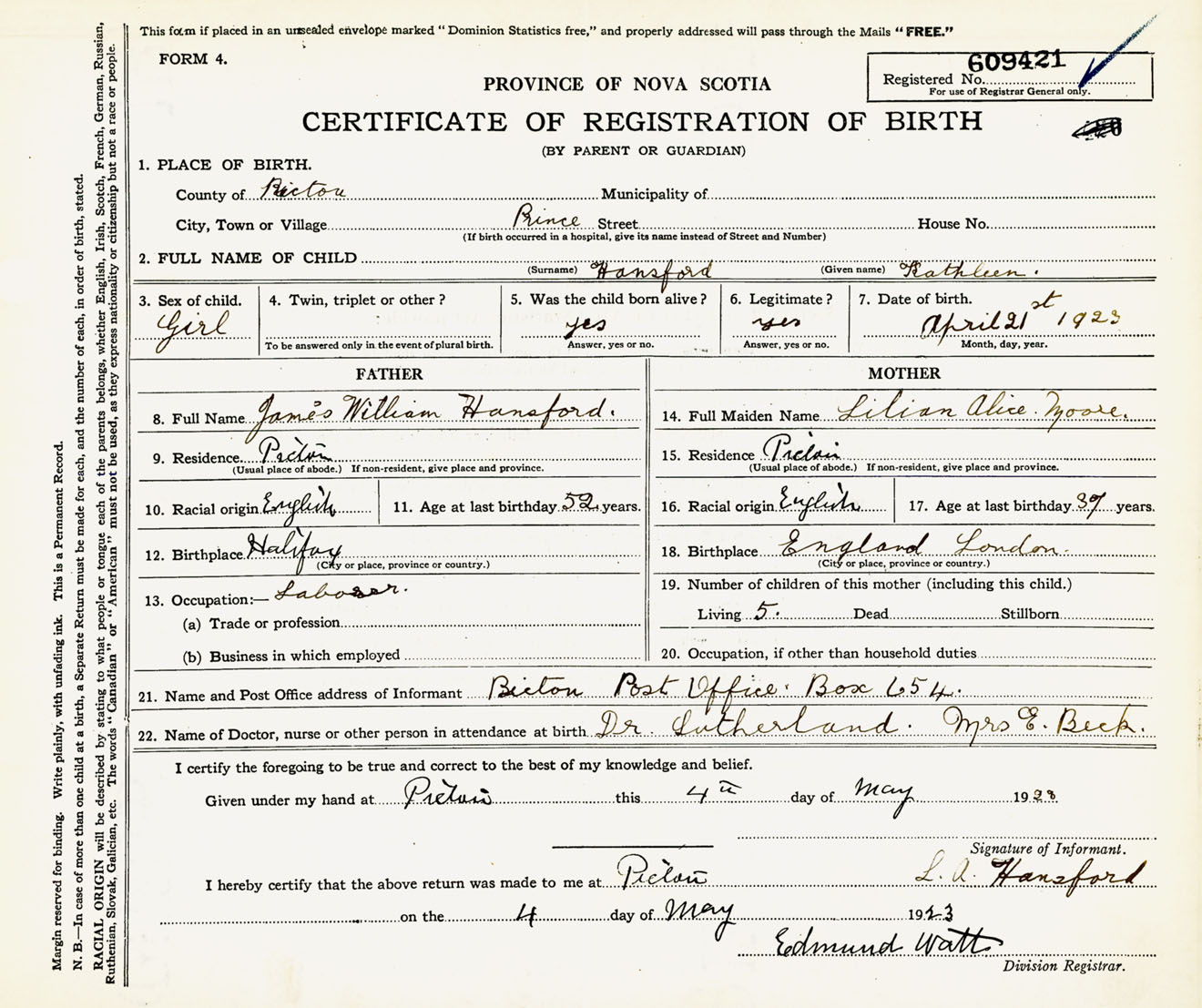 Female Birth Registration: Year: 1923 number: 60900421