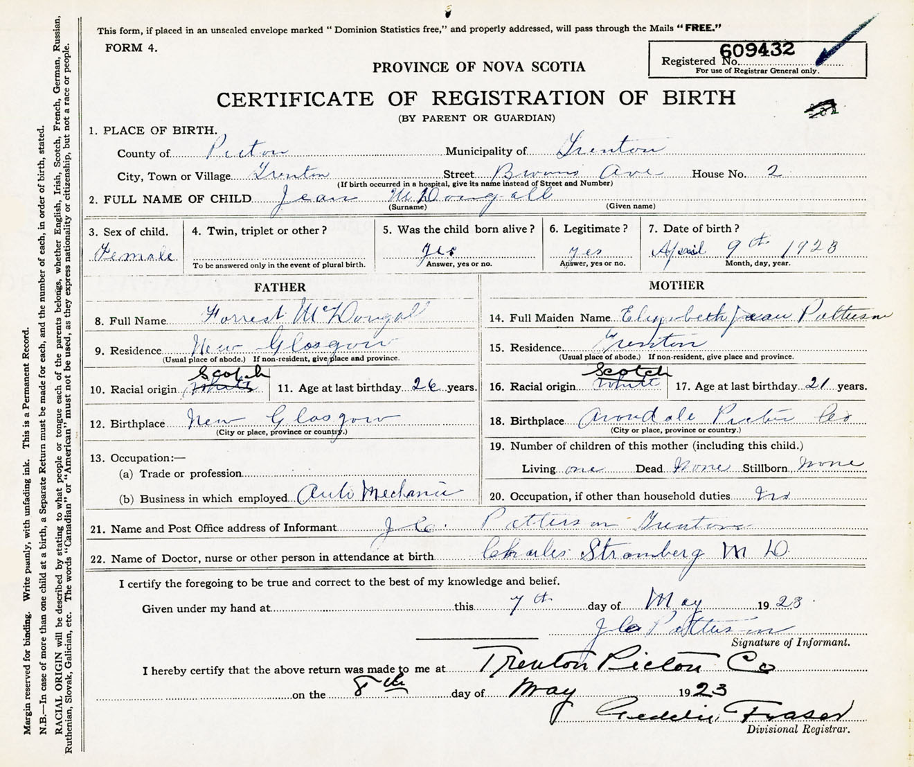 Female Birth Registration: Year: 1923 number: 60900432