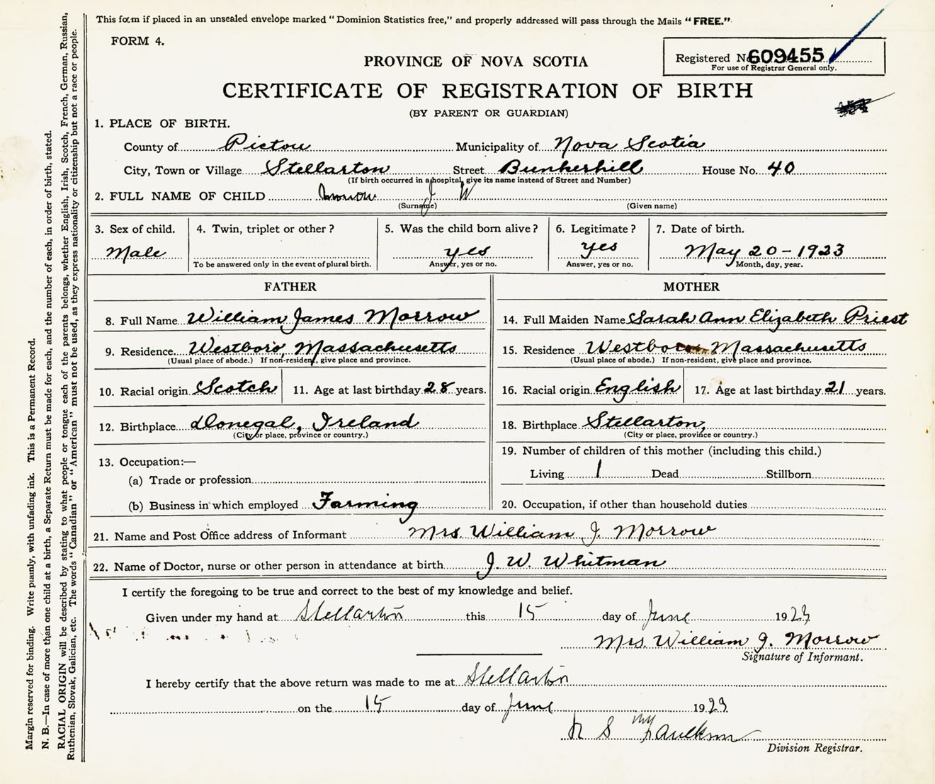 Male Birth Registration: Year: 1923 number: 60900455