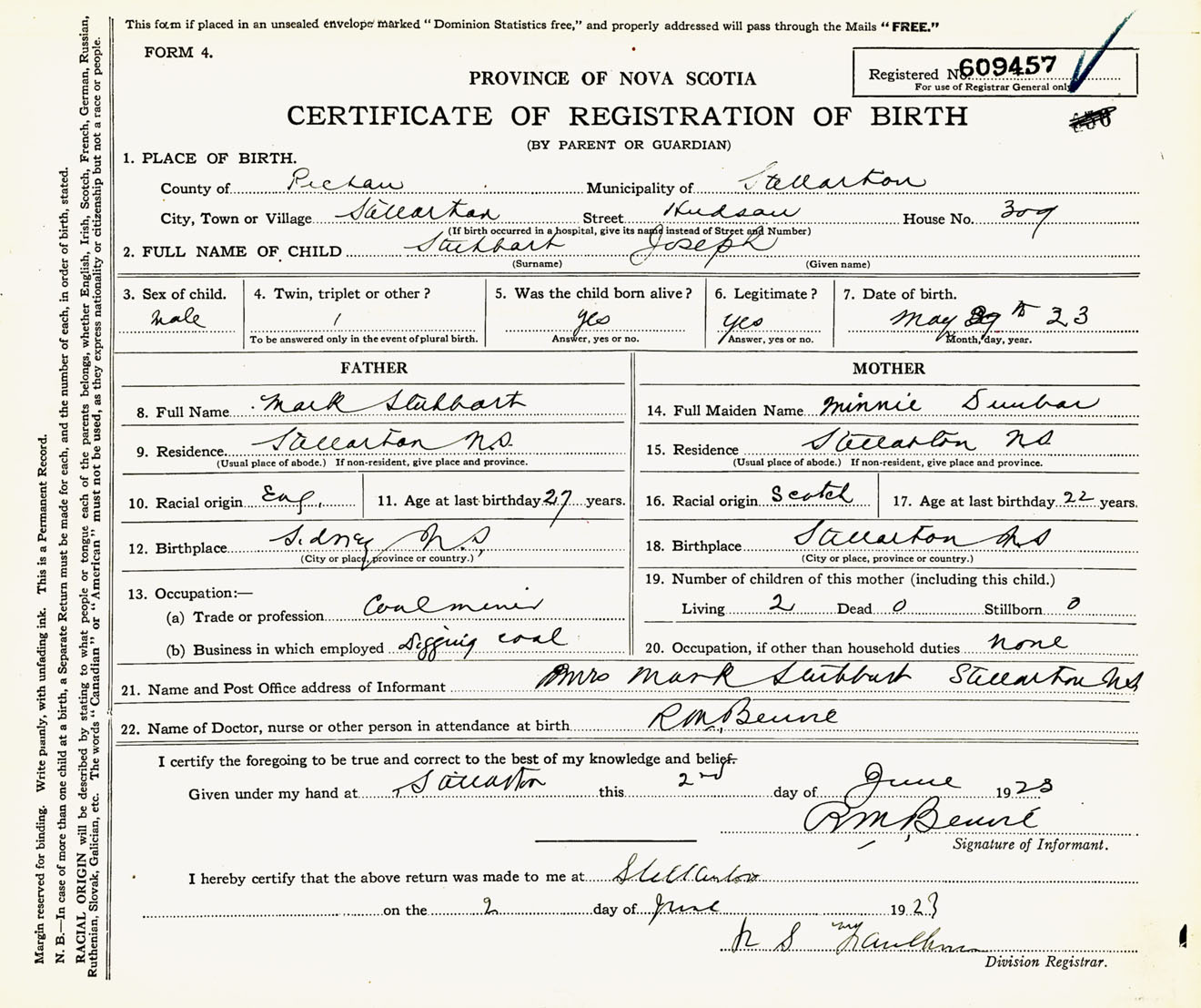 Male Birth Registration: Year: 1923 number: 60900457