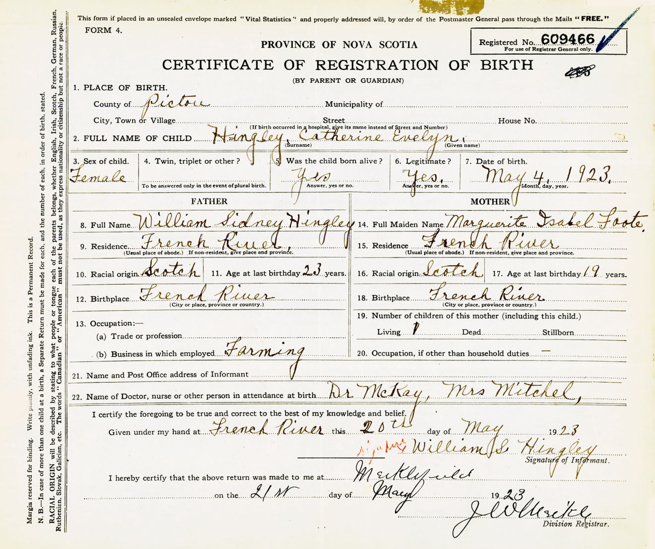 Female Birth Registration: Year: 1923 number: 60900466