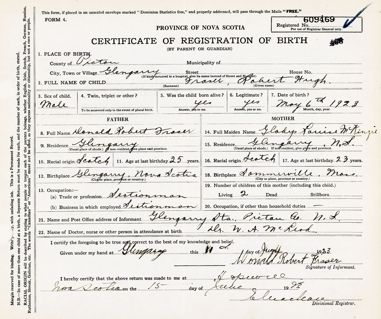 Male Birth Registration: Year: 1923 number: 60900469