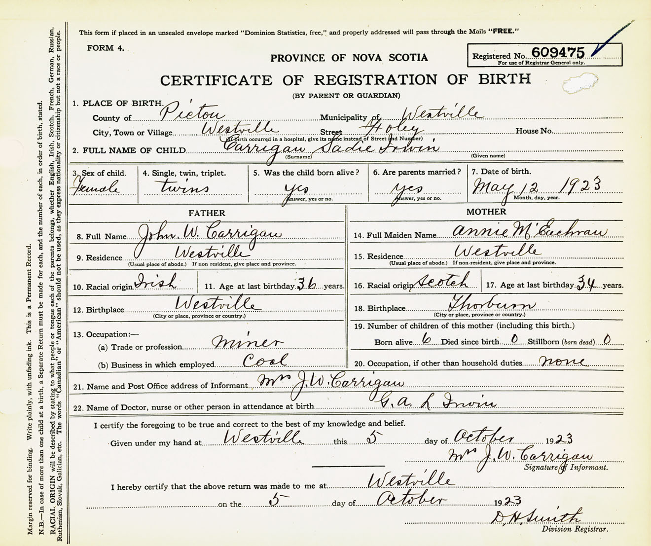 Female Birth Registration: Year: 1923 number: 60900475