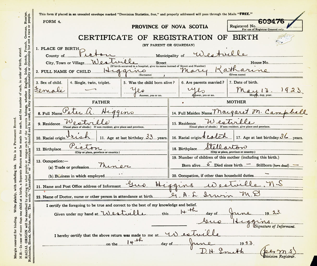 Female Birth Registration: Year: 1923 number: 60900476