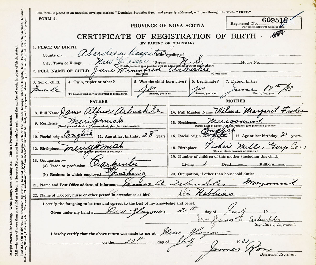 Female Birth Registration: Year: 1923 number: 60900518