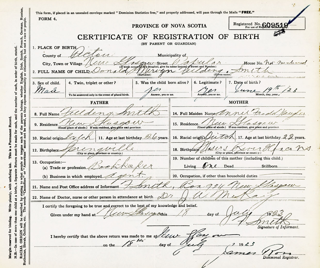 Male Birth Registration: Year: 1923 number: 60900519