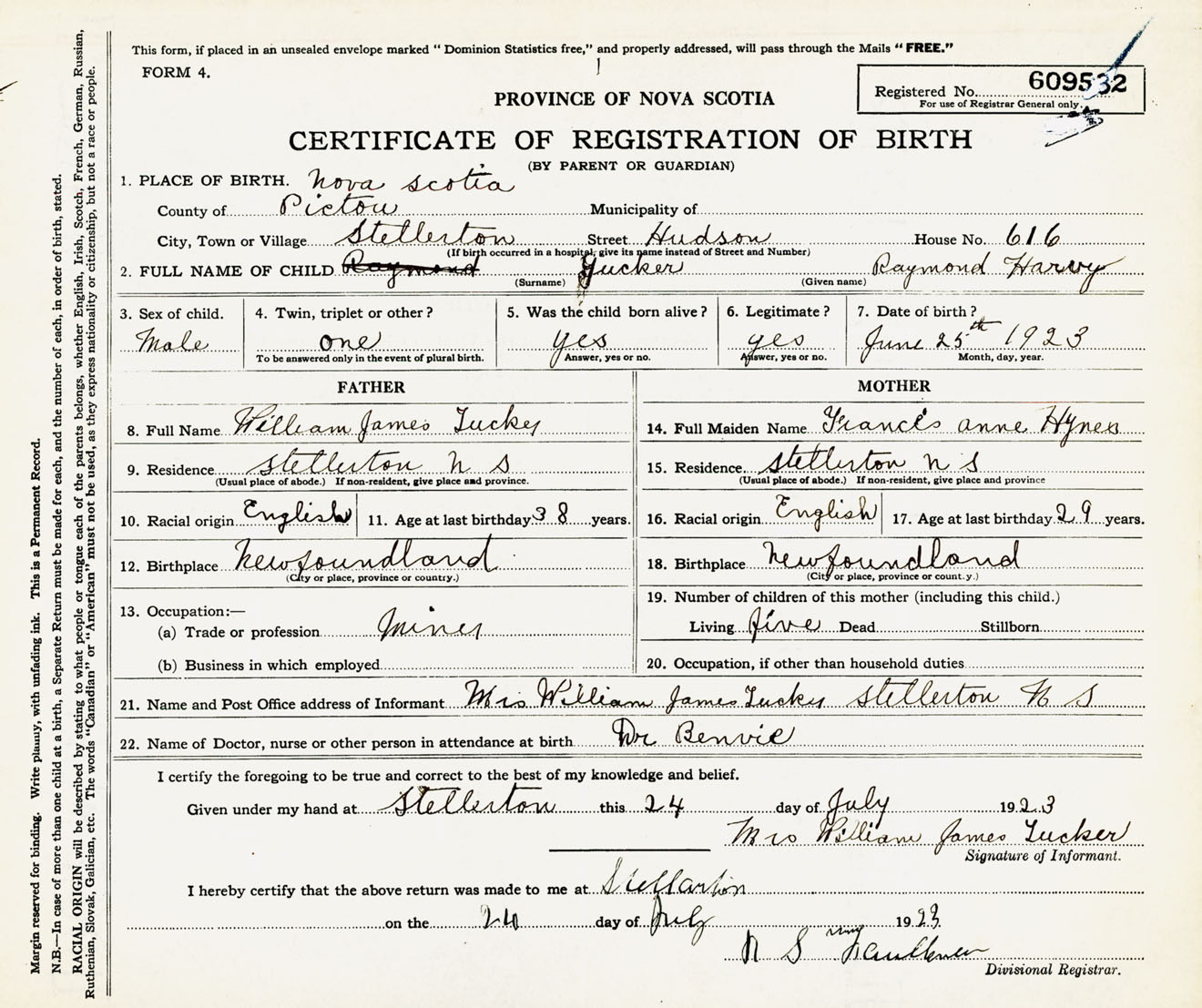 Male Birth Registration: Year: 1923 number: 60900532