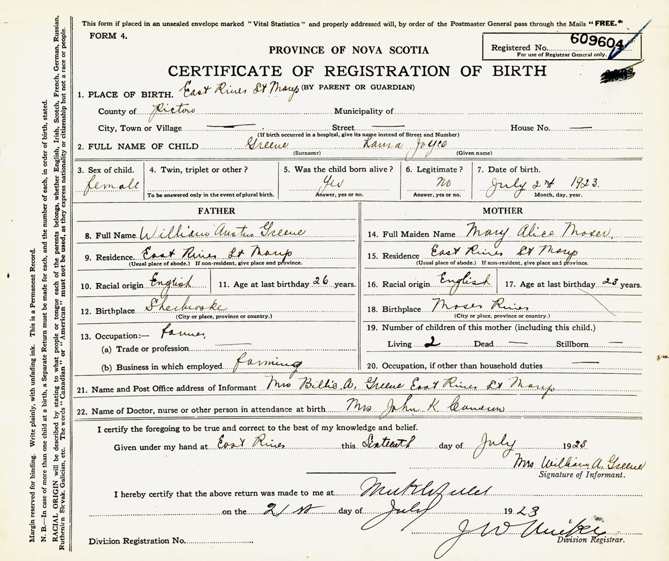 Female Birth Registration: Year: 1923 number: 60900604