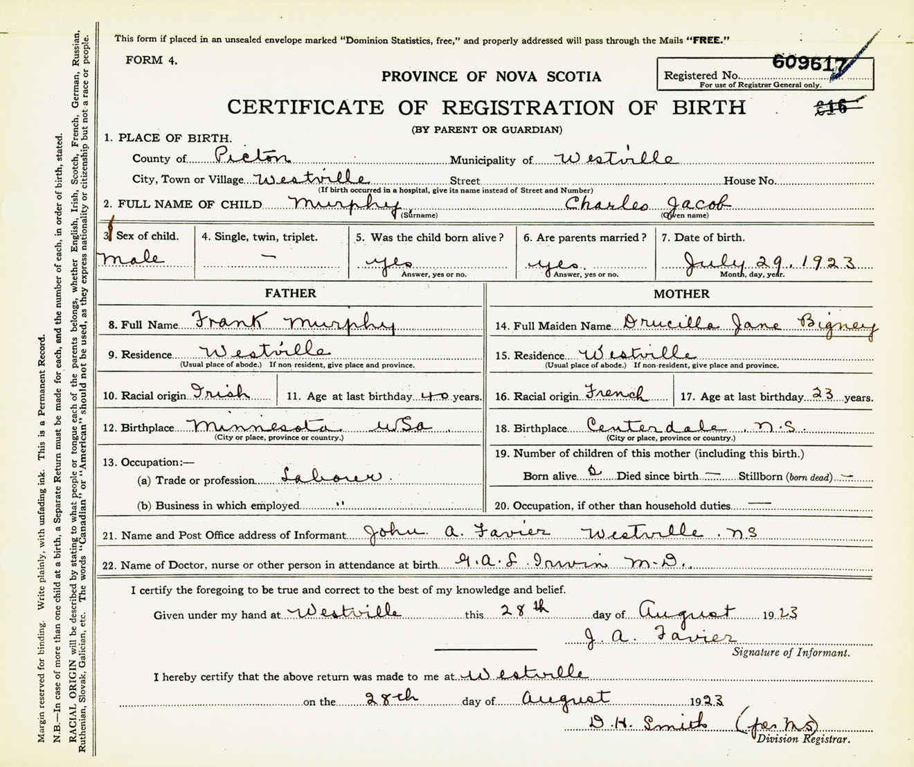 Male Birth Registration: Year: 1923 number: 60900617