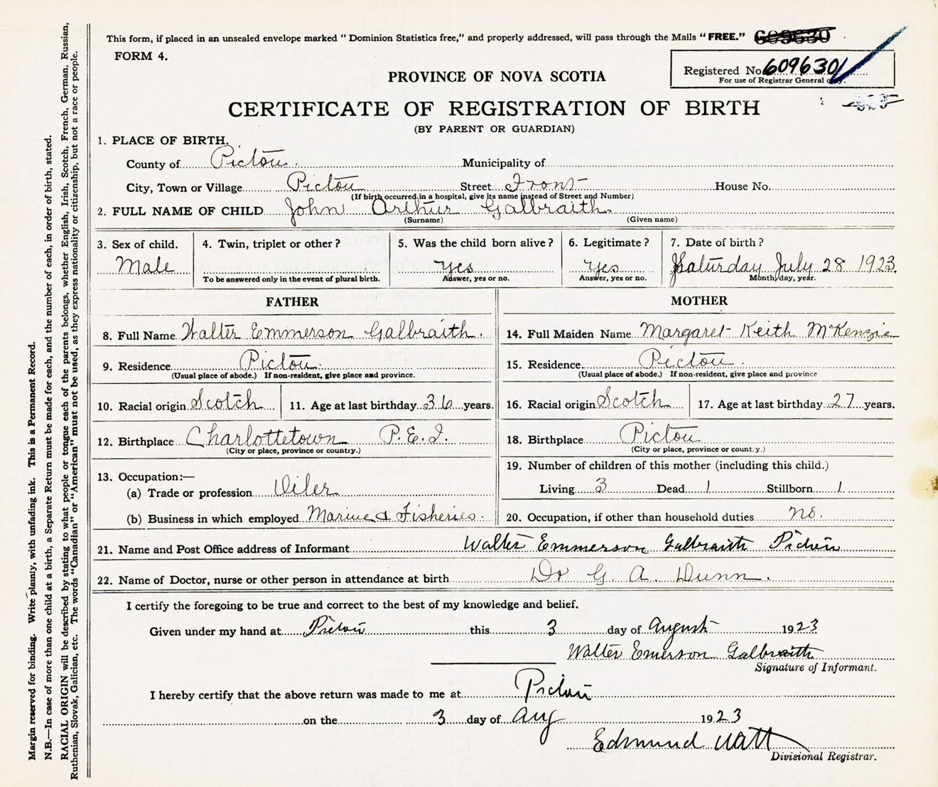 Male Birth Registration: Year: 1923 number: 60900630