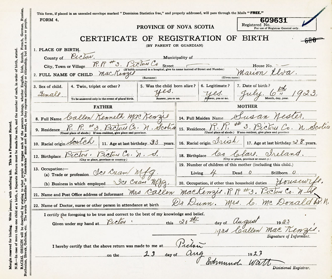 Female Birth Registration: Year: 1923 number: 60900631