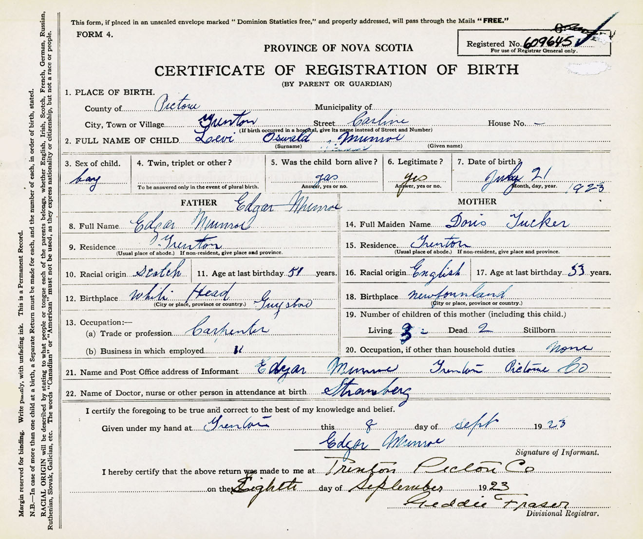 Male Birth Registration: Year: 1923 number: 60900645