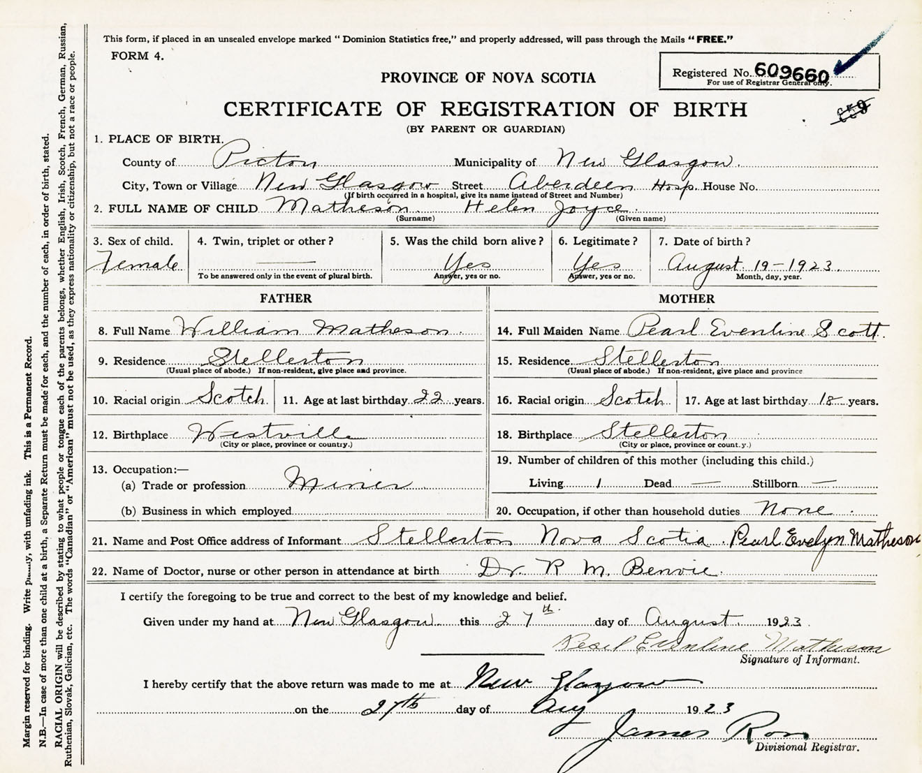 Female Birth Registration: Year: 1923 number: 60900660