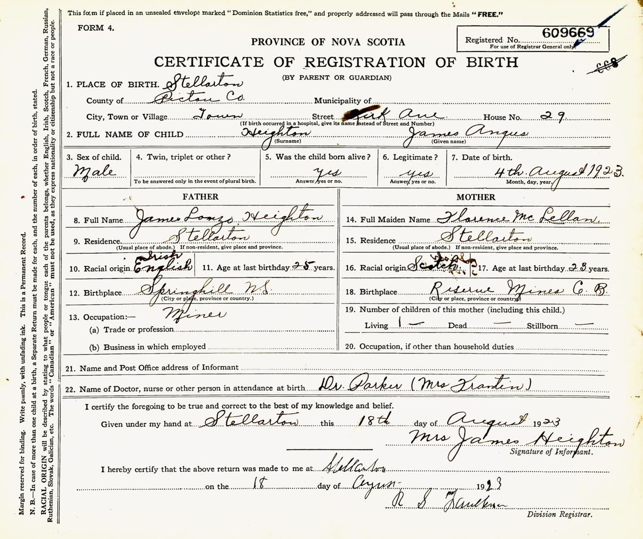 Male Birth Registration: Year: 1923 number: 60900669