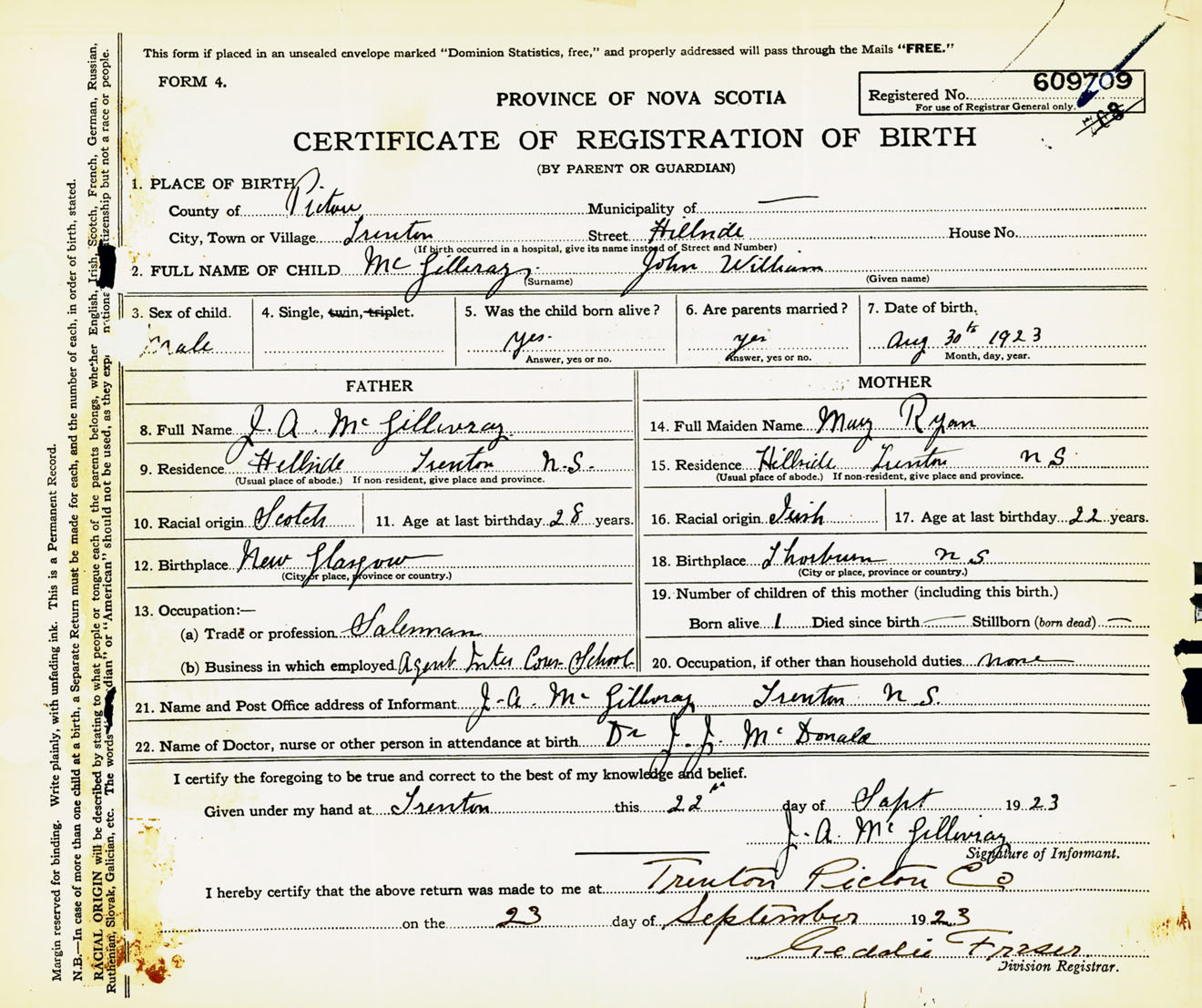 Male Birth Registration: Year: 1923 number: 60900709