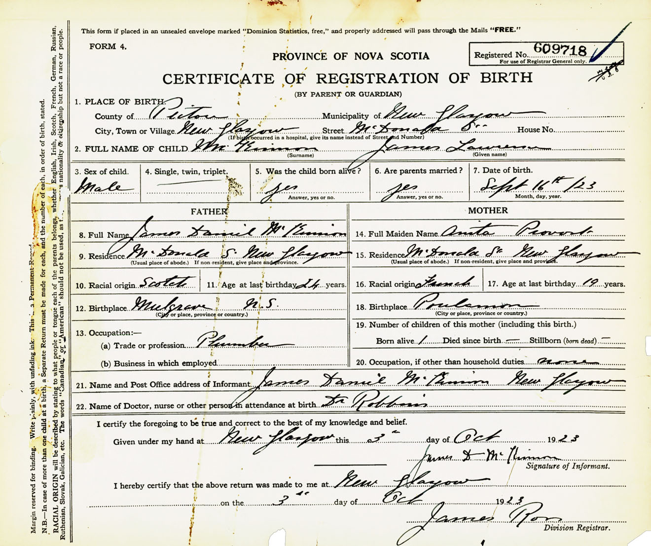Male Birth Registration: Year: 1923 number: 60900718