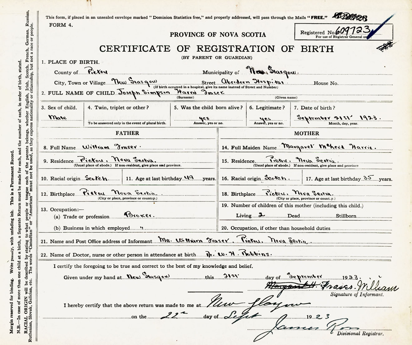 Male Birth Registration: Year: 1923 number: 60900723