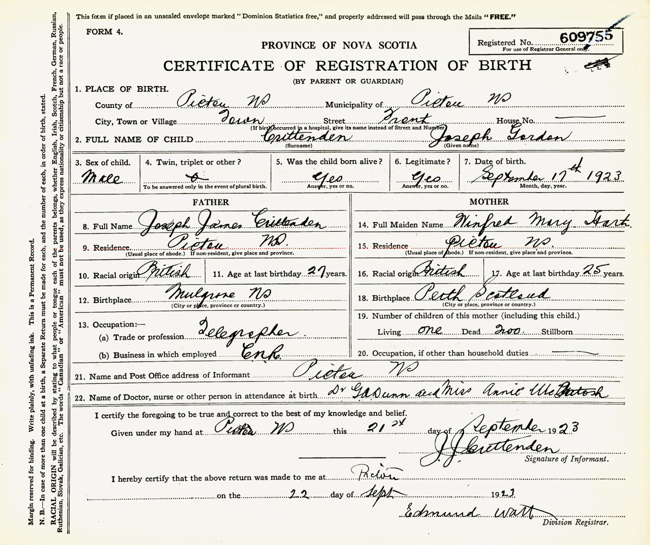 Male Birth Registration: Year: 1923 number: 60900755