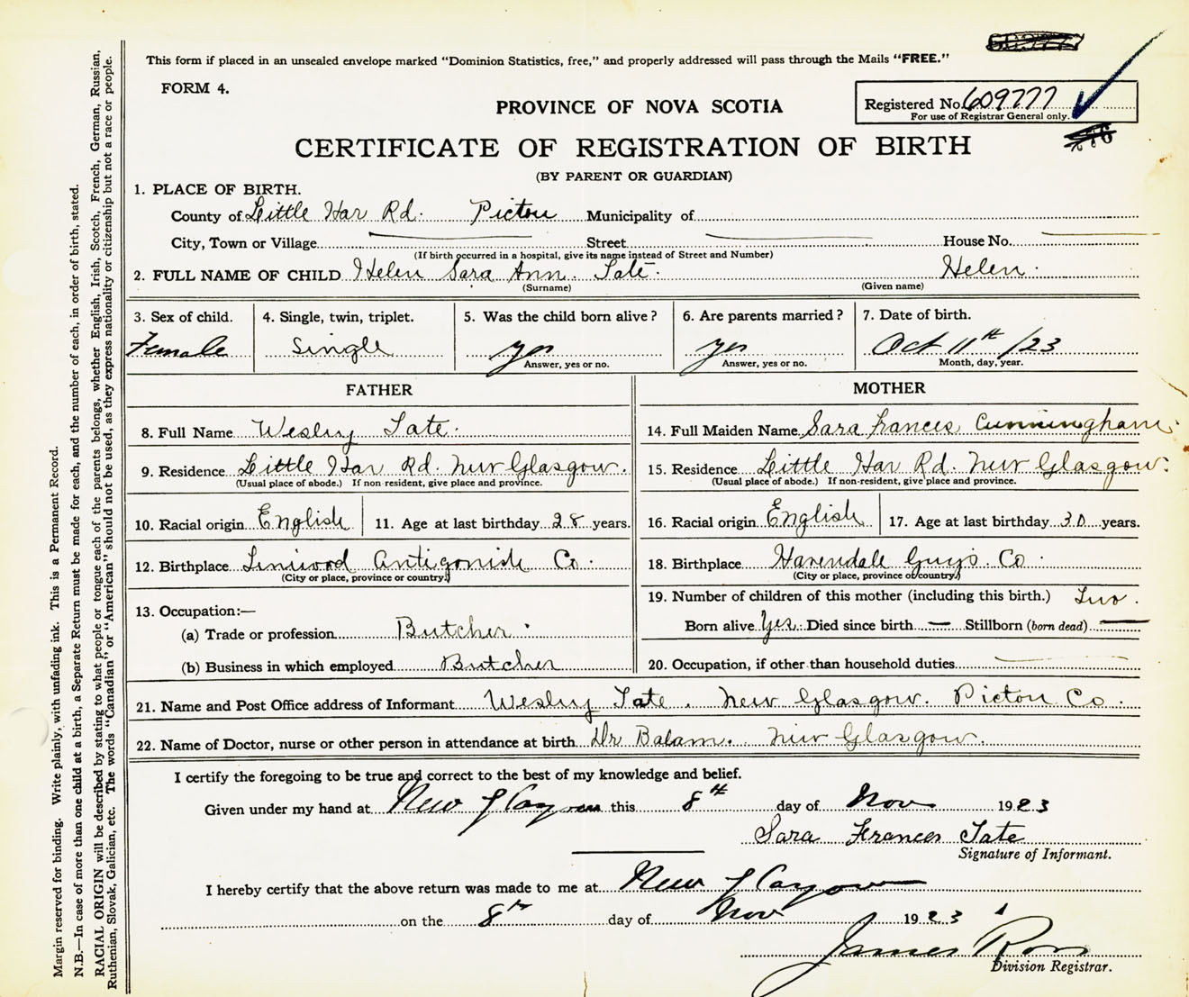 Female Birth Registration: Year: 1923 number: 60900777