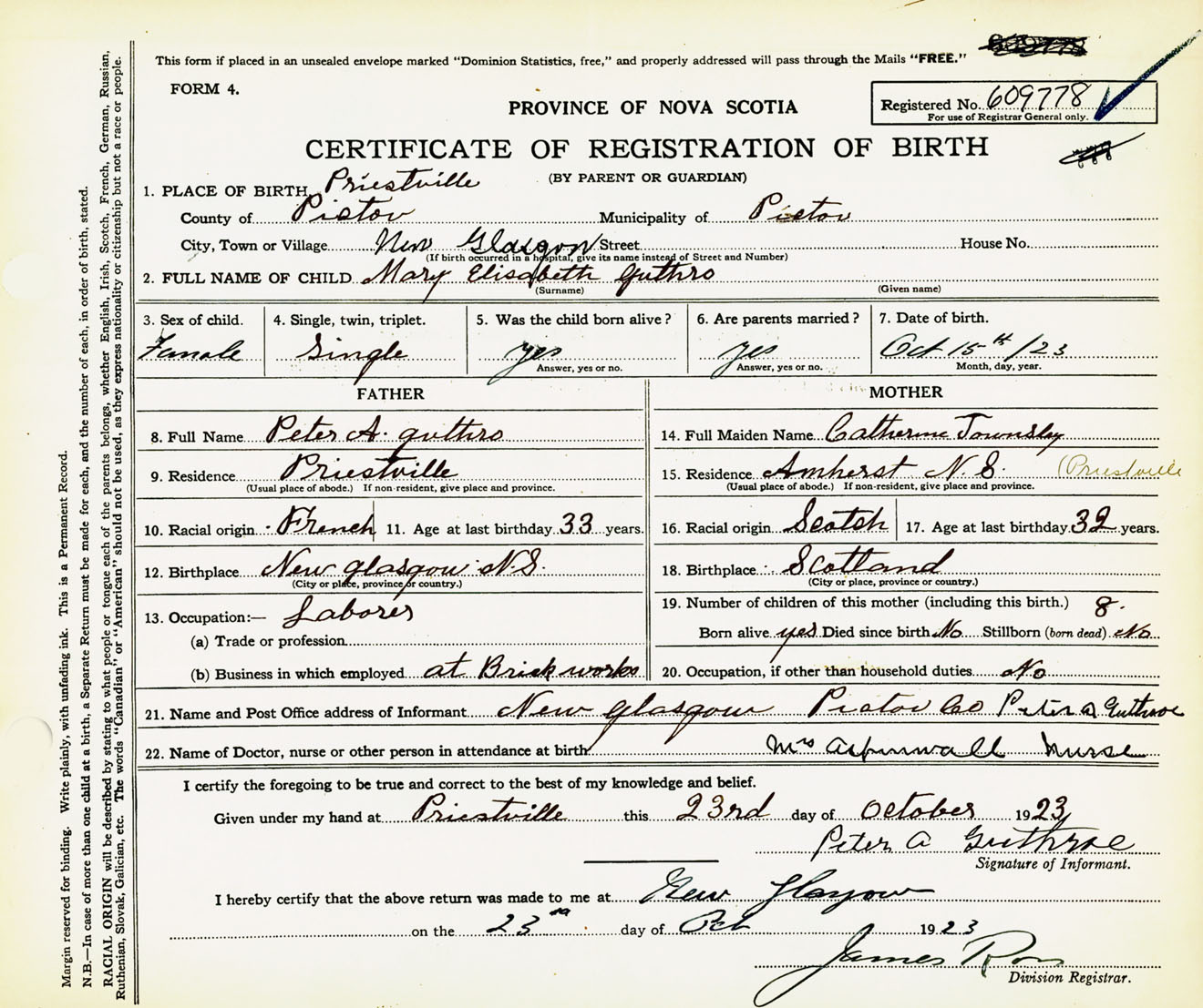 Female Birth Registration: Year: 1923 number: 60900778