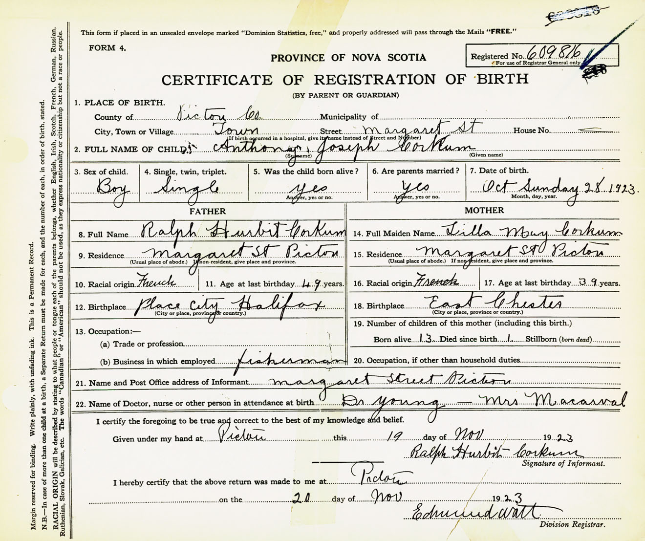 Male Birth Registration: Year: 1923 number: 60900816