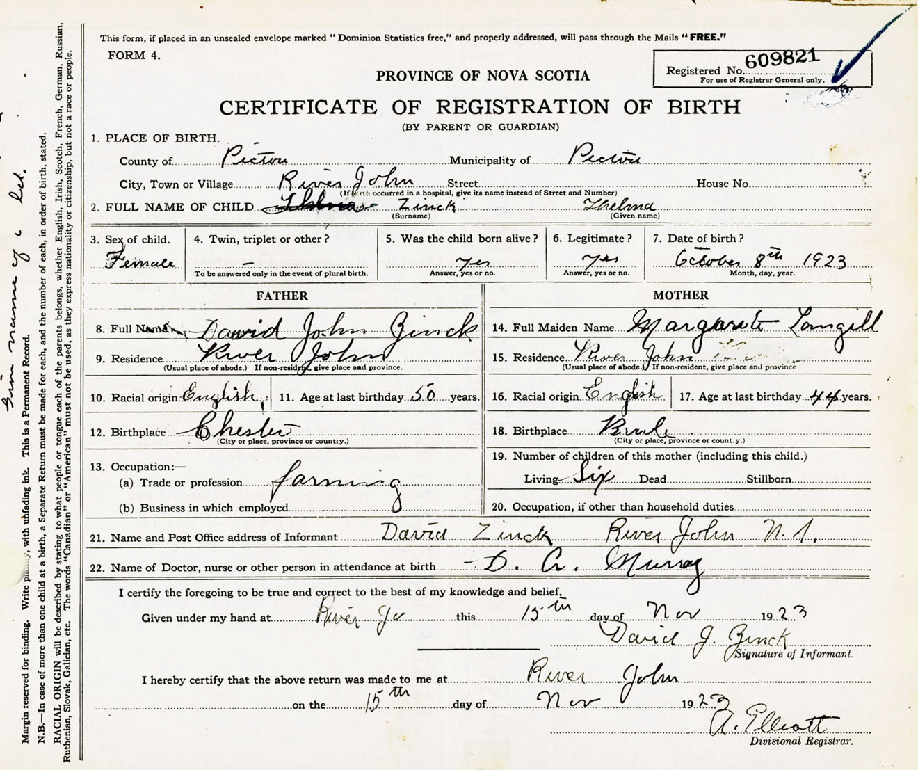 Female Birth Registration: Year: 1923 number: 60900821