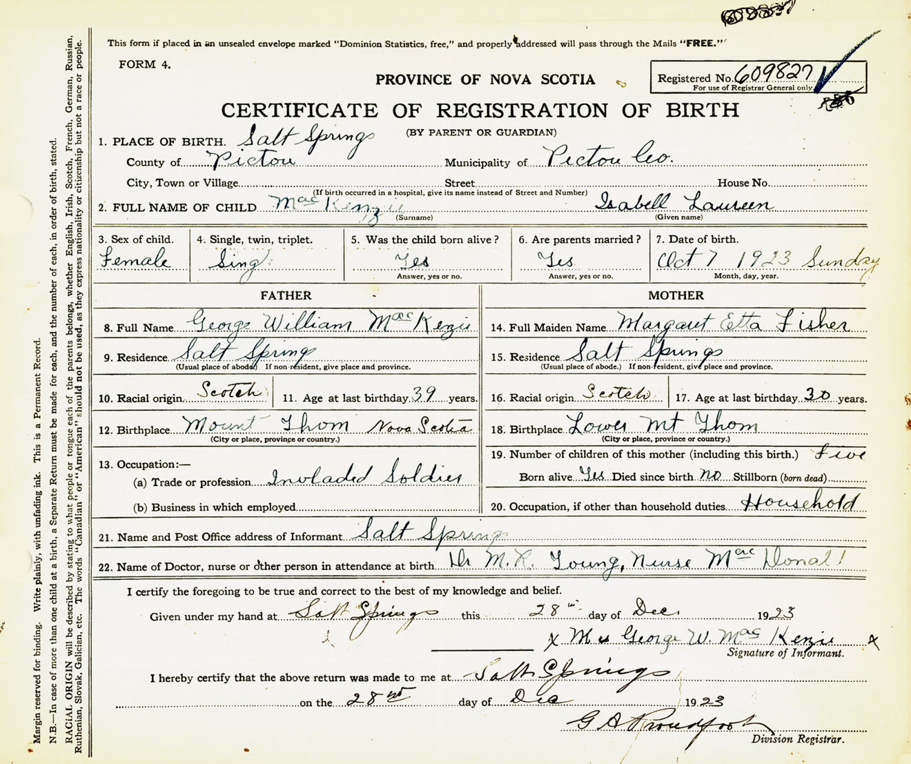 Female Birth Registration: Year: 1923 number: 60900827