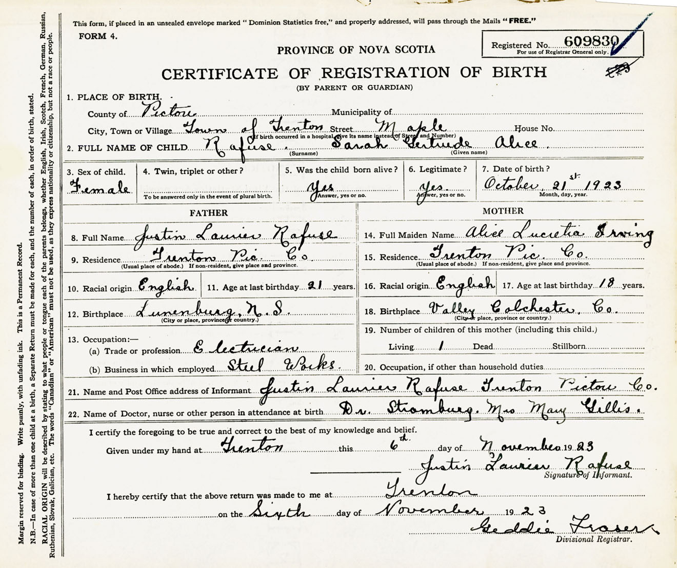 Female Birth Registration: Year: 1923 number: 60900830