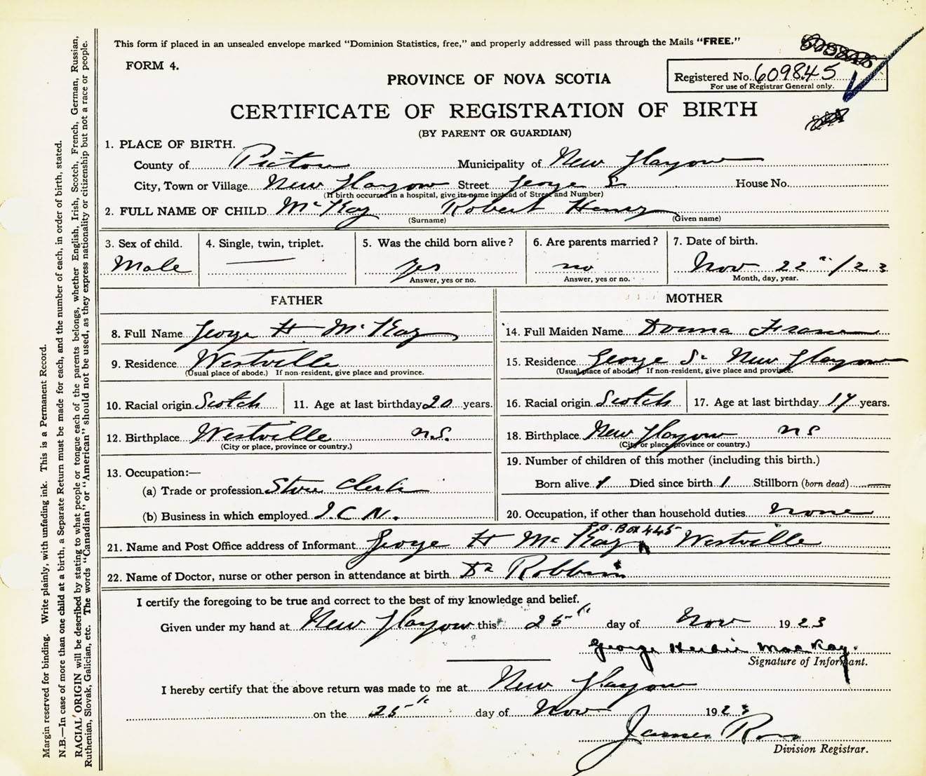 Male Birth Registration: Year: 1923 number: 60900845
