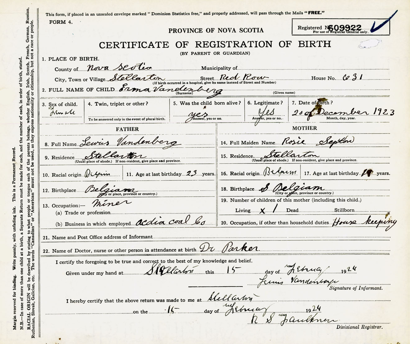 Female Birth Registration: Year: 1923 number: 60900922