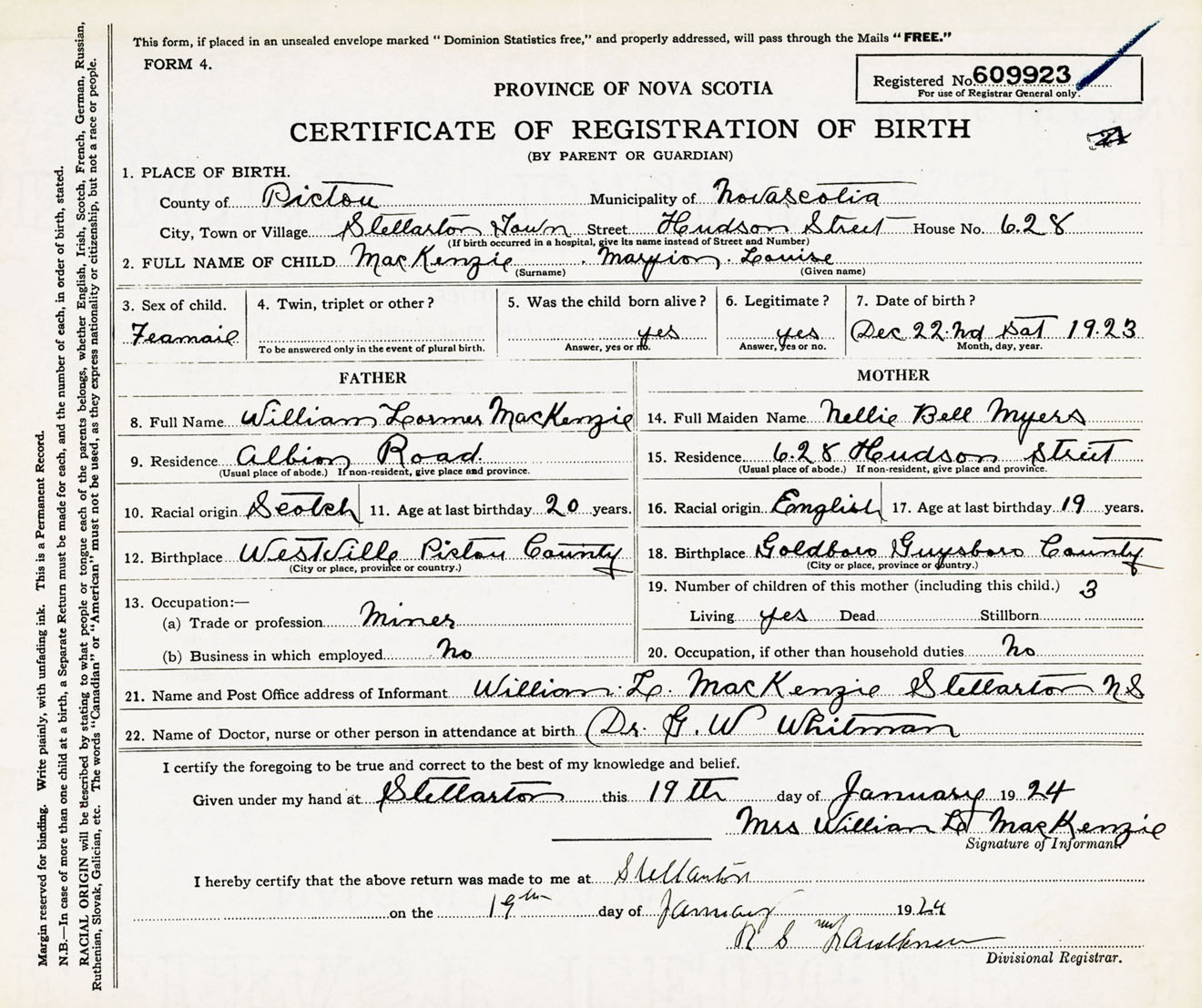 Female Birth Registration: Year: 1923 number: 60900923