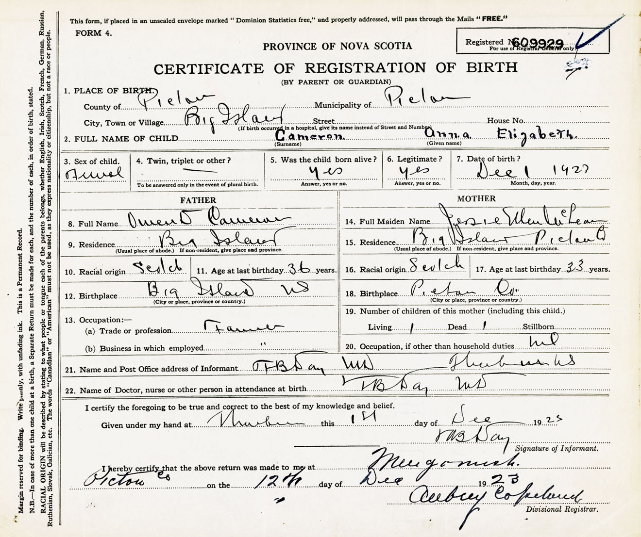 Female Birth Registration: Year: 1923 number: 60900929
