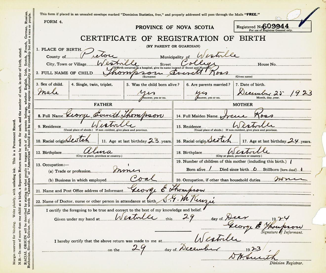 Male Birth Registration: Year: 1923 number: 60900944