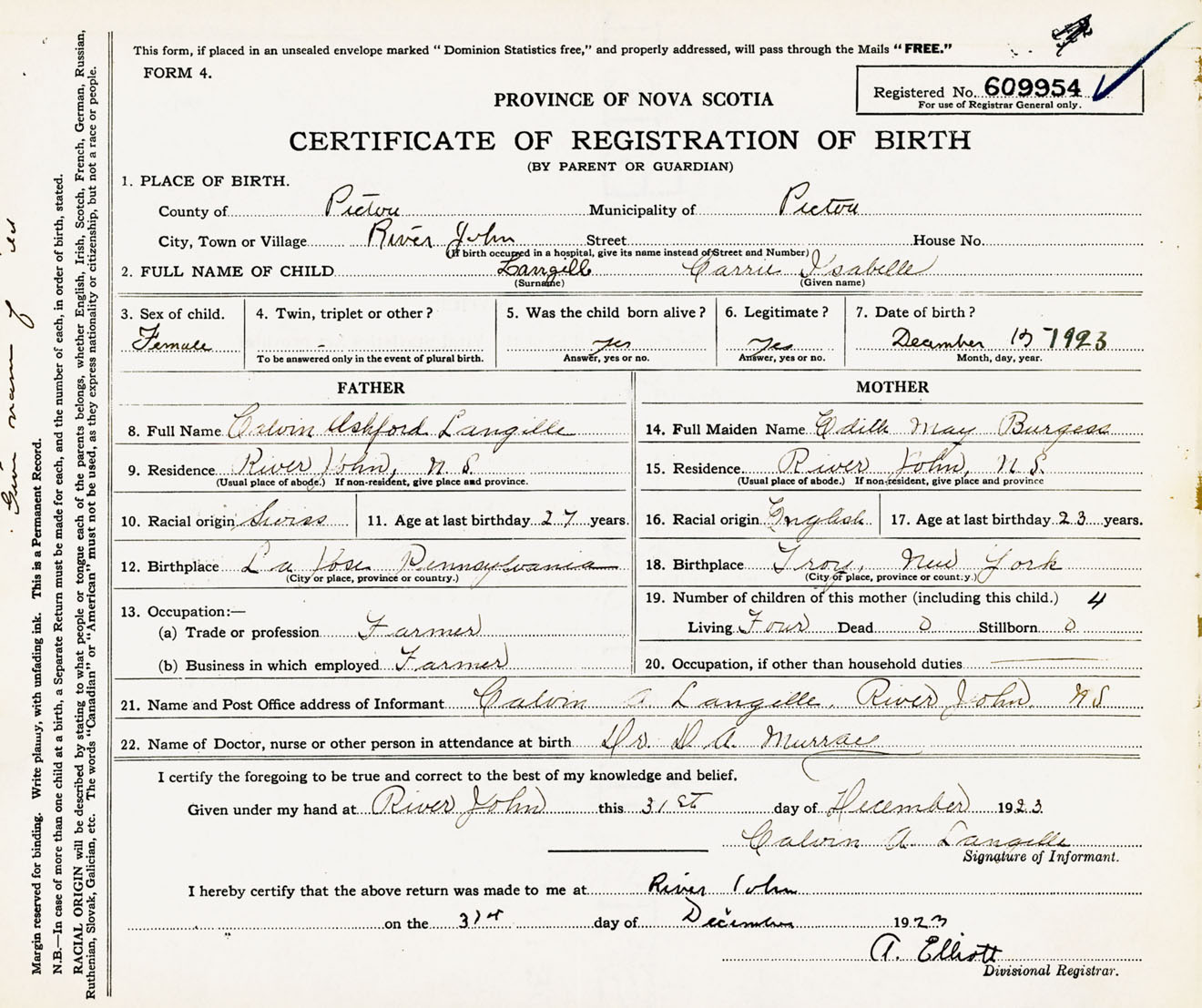 Female Birth Registration: Year: 1923 number: 60900954