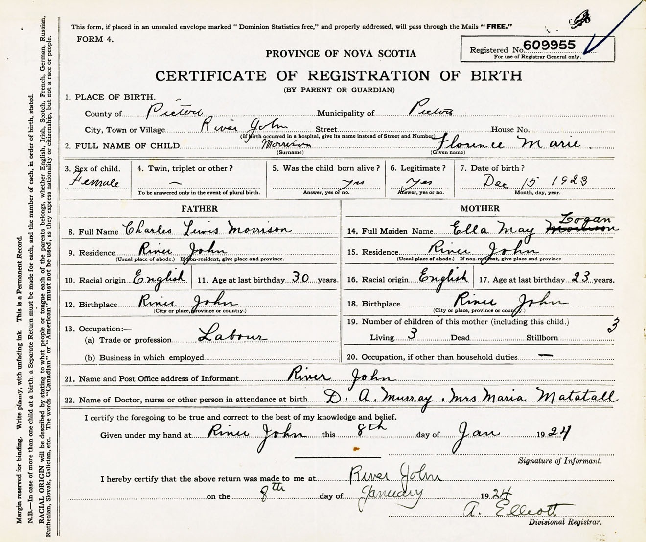 Female Birth Registration: Year: 1923 number: 60900955