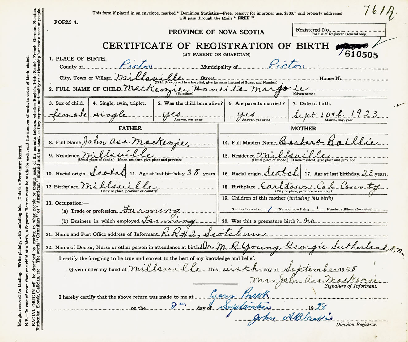Female Birth Registration: Year: 1923 number: 61000505