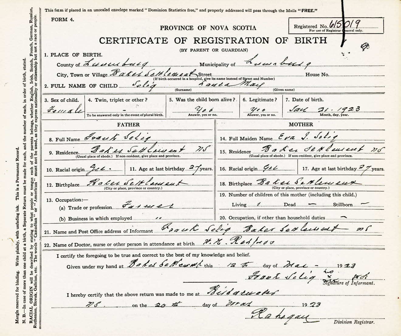 Female Birth Registration: Year: 1923 number: 61500019