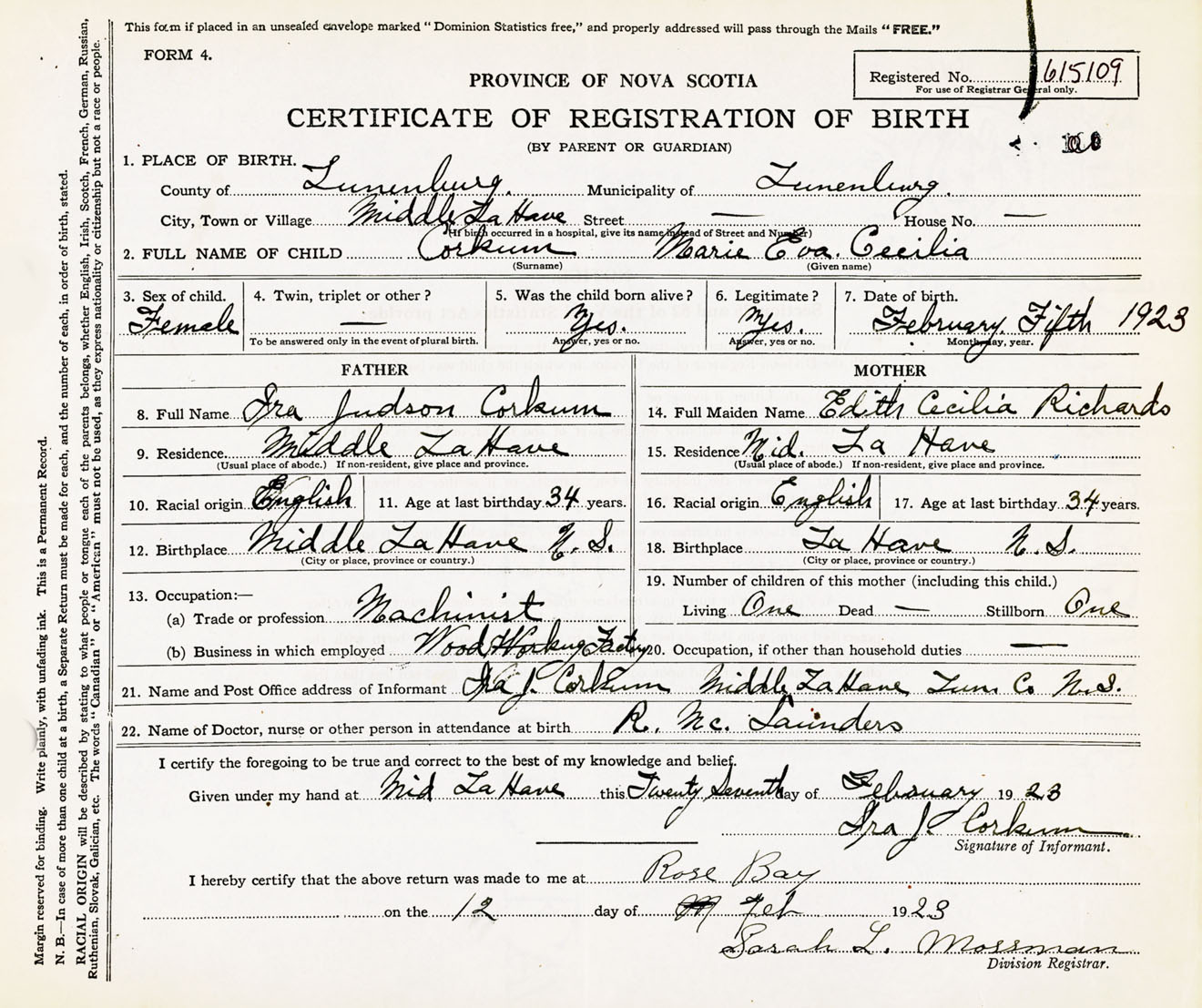 Female Birth Registration: Year: 1923 number: 61500109