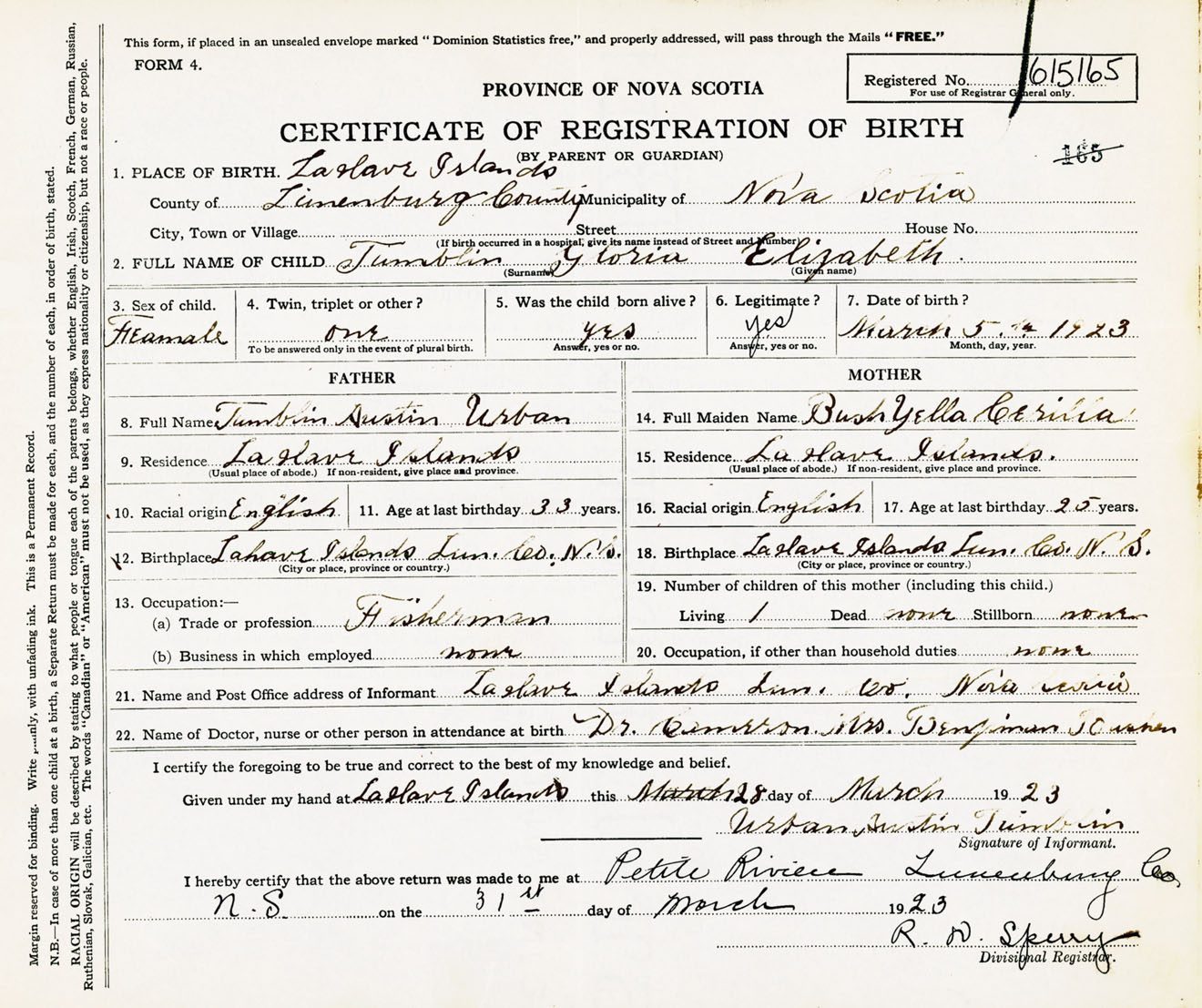 Female Birth Registration: Year: 1923 number: 61500165