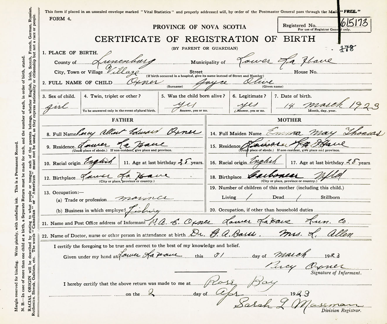 Female Birth Registration: Year: 1923 number: 61500173