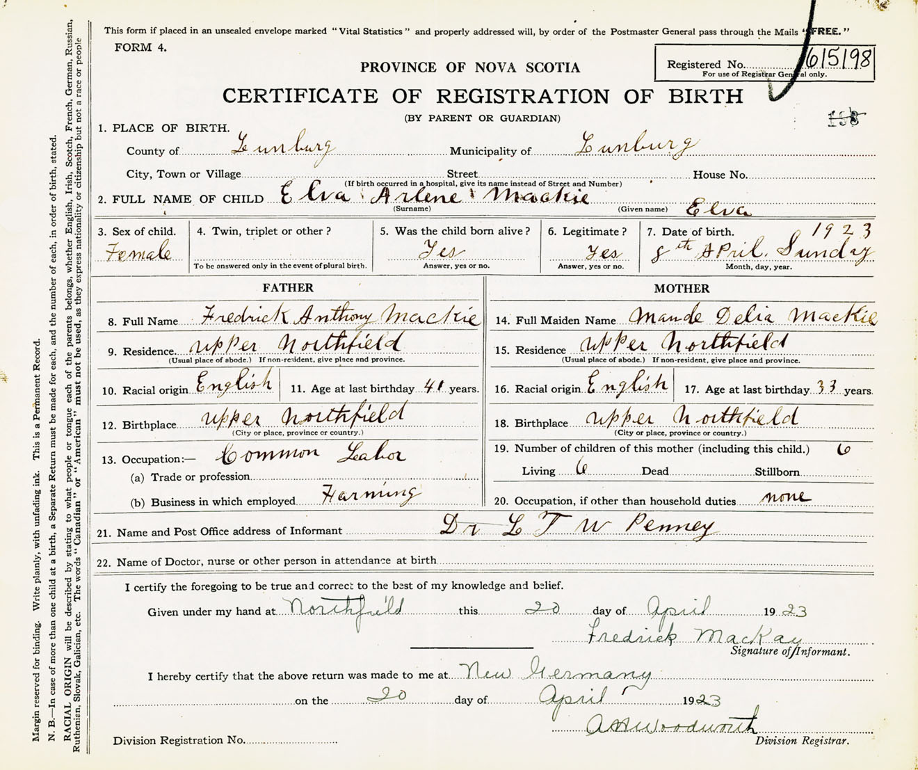 Female Birth Registration: Year: 1923 number: 61500198