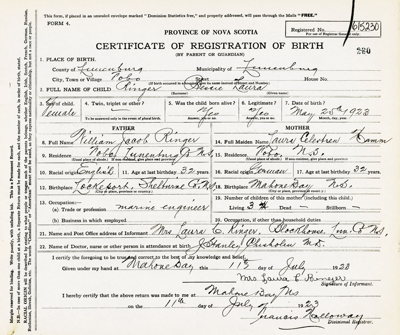 Female Birth Registration: Year: 1923 number: 61500230
