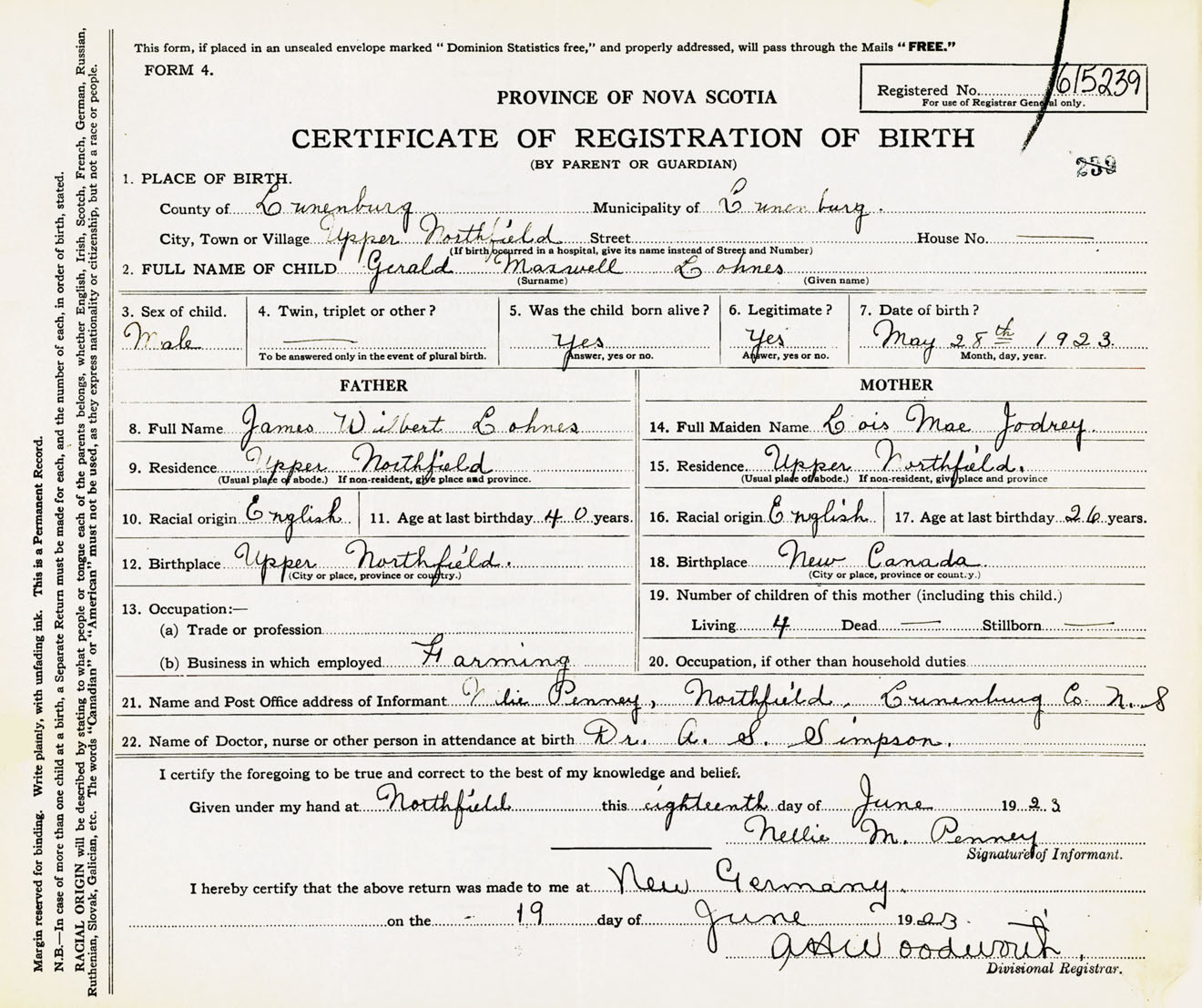 Male Birth Registration: Year: 1923 number: 61500239
