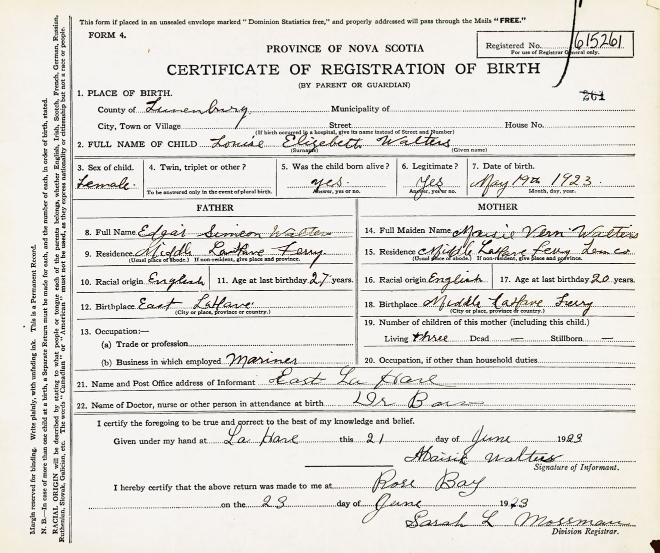 Female Birth Registration: Year: 1923 number: 61500261