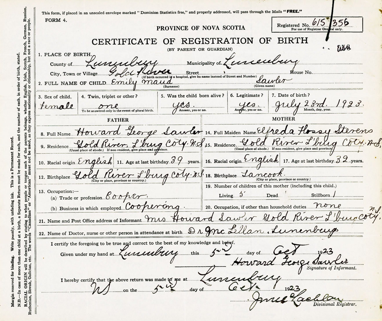 Female Birth Registration: Year: 1923 number: 61500356