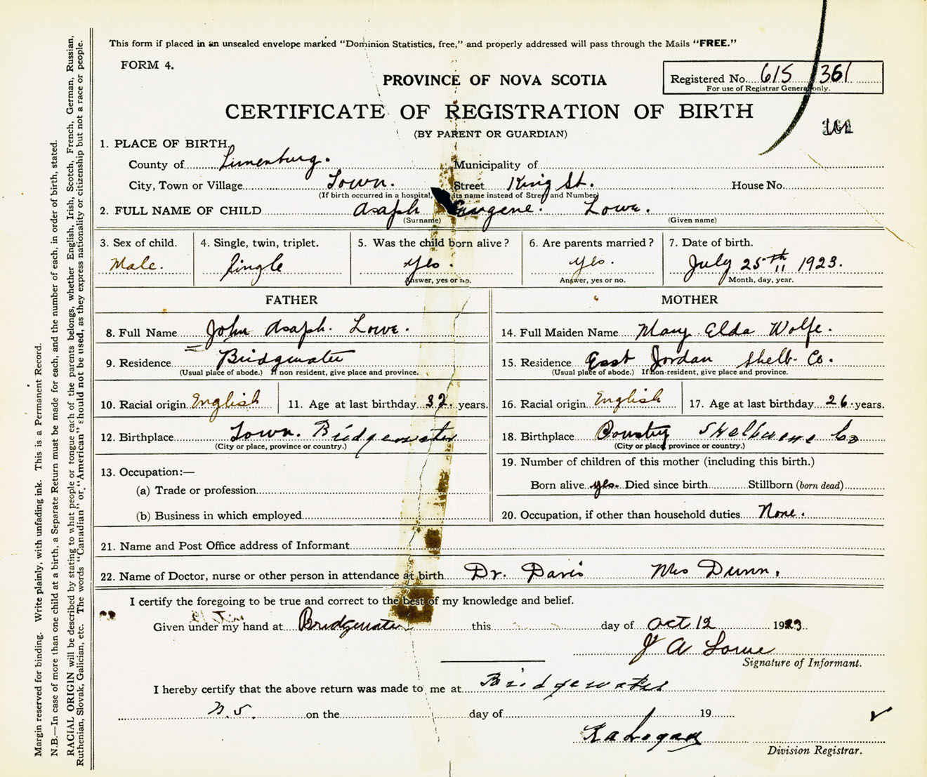 Male Birth Registration: Year: 1923 number: 61500361