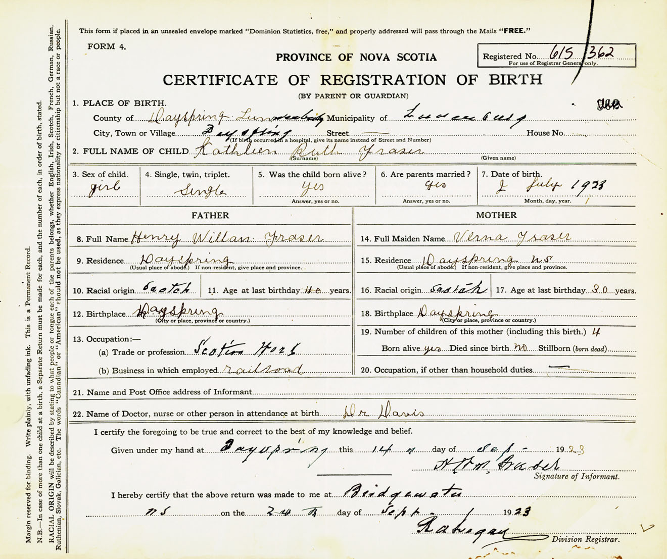 Female Birth Registration: Year: 1923 number: 61500362