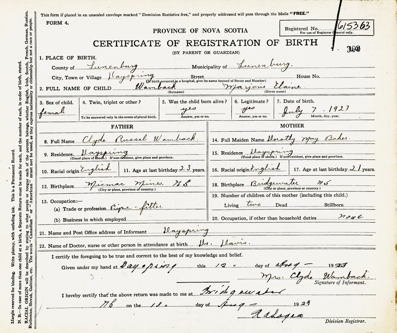 Female Birth Registration: Year: 1923 number: 61500363