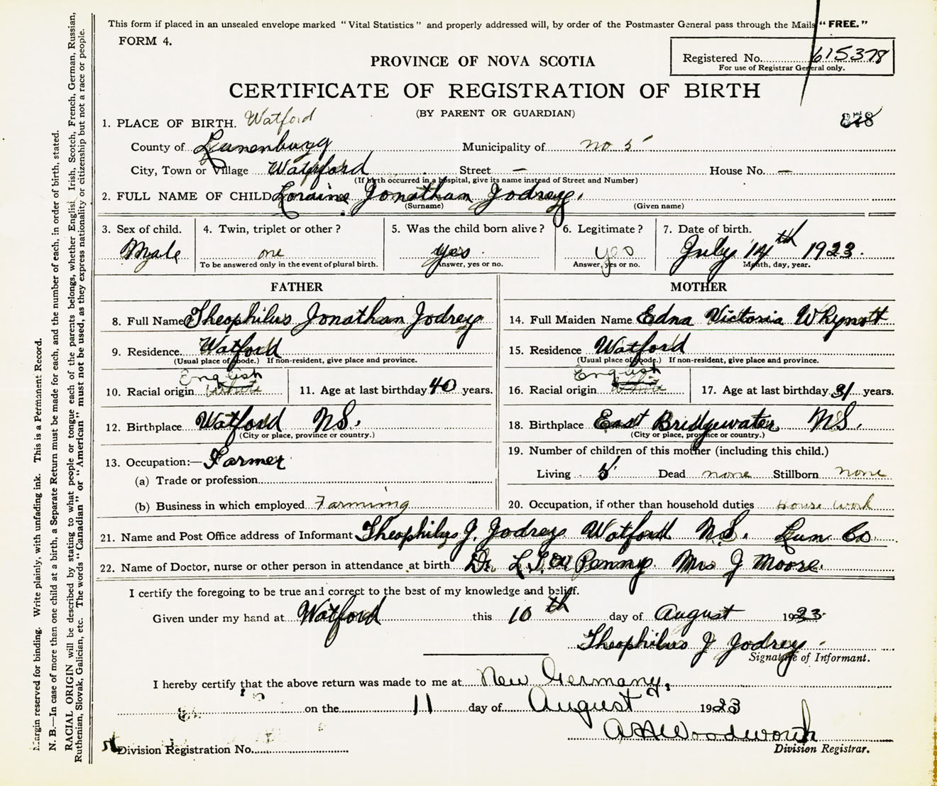 Male Birth Registration: Year: 1923 number: 61500378